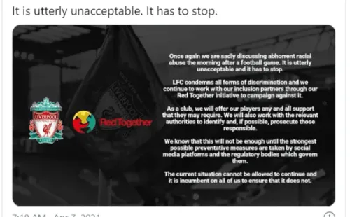 “Una vez más, estamos hablando con tristeza de abusos raciales aborrecibles la mañana después de un partido de fútbol. Es absolutamente inaceptable y tiene que detenerse… Como club, ofreceremos a nuestros jugadores todo el apoyo que puedan necesitar. También trabajaremos con las autoridades pertinentes para identificar y, si es posible, procesar a los responsables”, expresó el club.