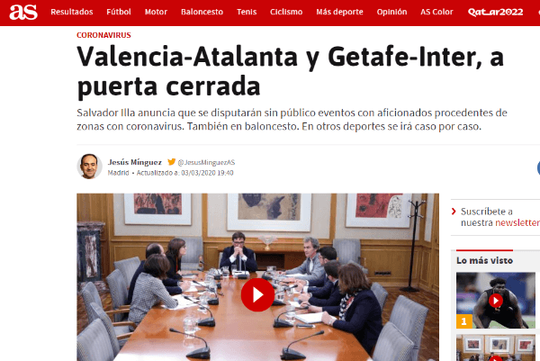 El gobierno ibérico decidió que Valencia vs Atalanta, 10 de marzo,se juegue a puertas cerradas. También pasará lo mismo en el choque entre Getafe e Inter el 19de marzo.