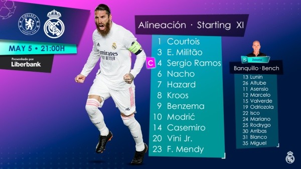 SeráMarco Asensio quién ocupará un lugar en el banco de los suplentes para que Hazard busque el pase a la final de Estambul. En una temporada cargada de lesiones, bajo rendimiento y críticas, Zidane vuelve a sorprender con un once donde además destaca la ausencia de Federico Valverde.