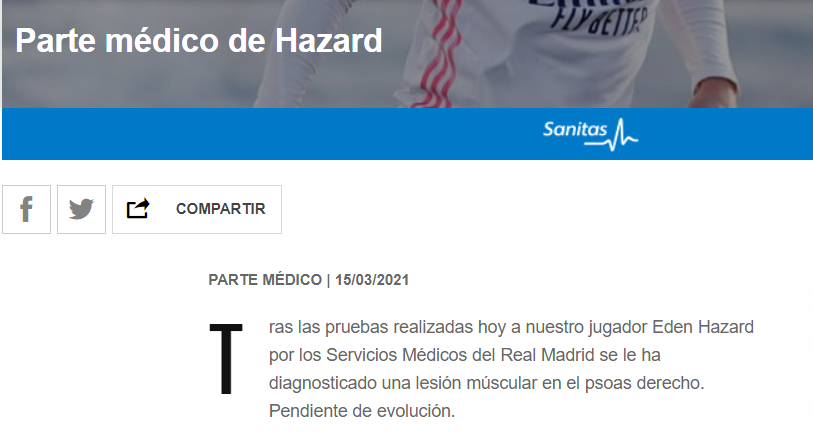 “Tras las pruebas realizadas hoy a nuestro jugador Eden Hazard por los Servicios Médicos del Real Madrid se le ha diagnosticado una lesión múscular en el psoas derecho. Pendiente de evolución”, comenta el mismo.