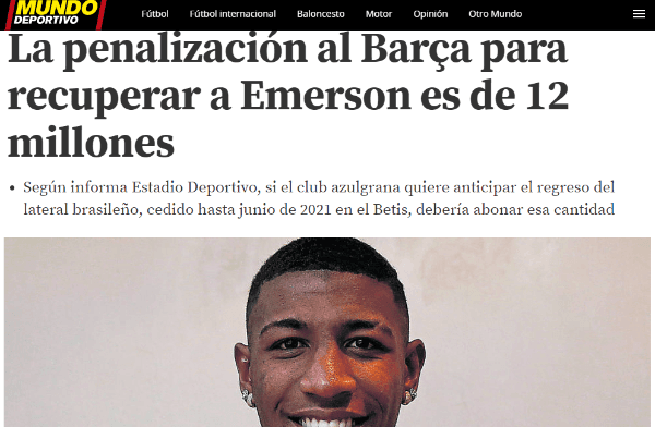 Este es el caso de Emerson. Un lateral brasileño que llegó al Real Bétis a préstamo hasta junio de 2021 y que, además, le compraron el 50% del pase a cambio de 6 millones de euros.