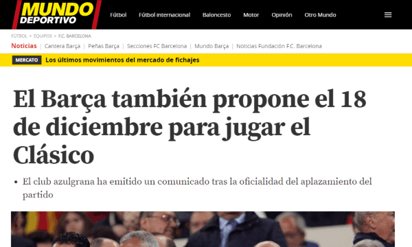 El Barcelona propuso jugar el clásico contra el Real Madrid el 18 de diciembre