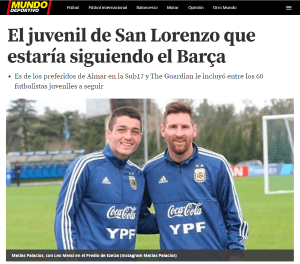 Según cuenta Mundo Deportivo, los scoutings del club catalán pusieron sus ojos sobre Matías Palacios. Un jugador de 17años que pertenece a San Lorenzo y está jugando el Mundial Sub 17.