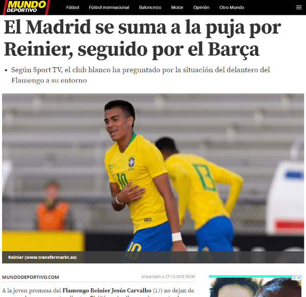 Ahora el apuntado es Reinier. El volante de 17 años viene de salir campeón con el Fla de la Copa Libertadores y contó con varios minutos, pese a que no es titular y suele entrar desde el banco.