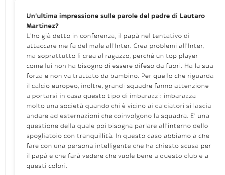 “El padre, en un intento de atacarme, hiere al Inter. Crea problemas en el Inter, pero sobre todo los crea para el chico, porque un jugador como él no necesita ser defendido desde afuera. Tiene su personalidad y no debe ser tratado como un niño”, declaró Spaletti.