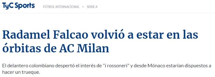 Si bien el Milansondeó a varios artilleros de diversas ligas, todo indica que el equipo de Italiase encuentra completamente determinado a luchar hasta el final para hacerse con los servicios del artillero colombiano.