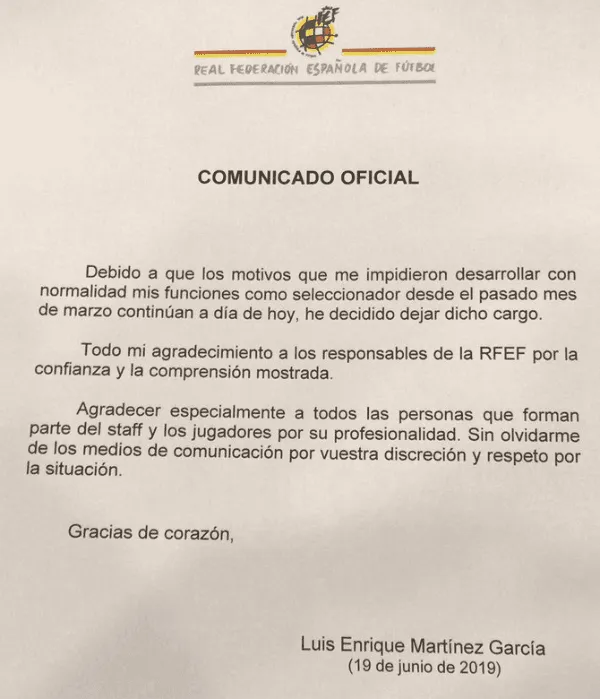 Dado que no pudo sentarse en el banquillo en los últimos compromisos de España, alegando motivos personales, Enrique tomó la decisión de apartarse de su cargo y dejar disponible su puesto.