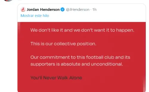 No tardó en llegar el repudio de todas partes, y lo que más se esperaba era que los propios futbolistas levanten la voz, sobre todo aquellas figuras del deporte mundial, para así lograr que den marcha atrás con semejante idea. Uno de los mensajes más destacados fue el que lanzó el plantel del Liverpool en conjunto, publicado en la cuenta oficial de Jordan Henderson.
