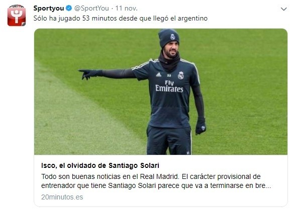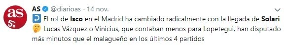 Es que al talentoso mediocampista español no le ha tocado participar como titular de ninguno de los encuentros que disputó Real Madrid desde que Solari se sentó en el banquillo.
