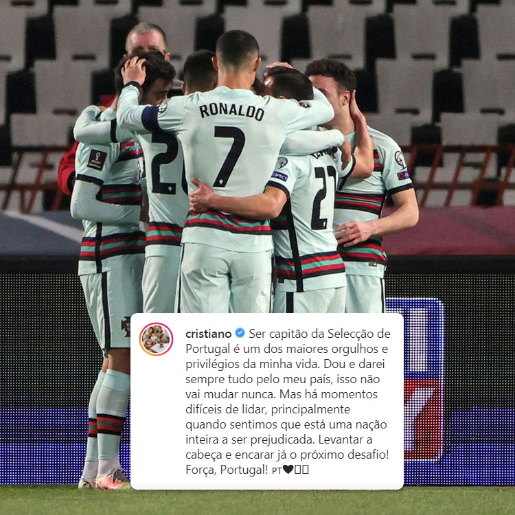 En su cuenta de Instagram, el delantero de la Juventus subió una foto suya felicitando a sus compañeros y escribió: “Ser capitán de la Selección de Portugal es uno de los mayores orgullos y privilegios de mi vida. Siempre doy y daré todo por mi país, eso nunca cambiará. Pero hay momentos difíciles que afrontar, especialmente cuando sentimos que se está perjudicando a toda una nación“.