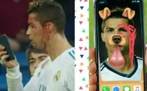 Cristiano Ronaldo marcó el segundo gol del Real Madrid de cabeza y le pegaron una patada en la cara que lo dejó lleno de sangre, tanto que pidió ver cómo había quedado su rostro y para eso tomó un celular.