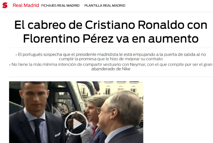 Según detalló el diario Sport, el crack portugués continuaría elevando su enojo con el presidente del Real Madrid.Además, el medio comenta y desliza que “el delantero portuguésse siente traicionado por Florentino Pérez”.