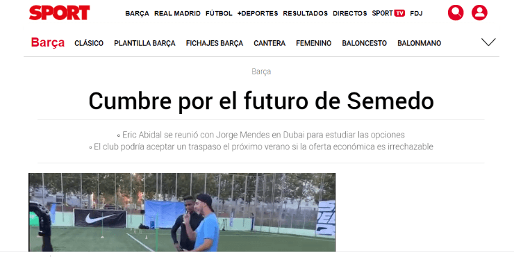 Según explicó Sport,Éric Abidal, Director Deportivo del elenco de España, se habría reunido con Jorge Mendes en Dubai para hablar sobre el futuro de Nélson Semedo.