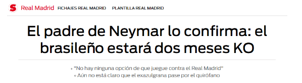 ¿Qué quiere decir esto? Que, efectivamente, Neymar no estará en el choque de vuelta de octavos de la Championsante el Merengue.