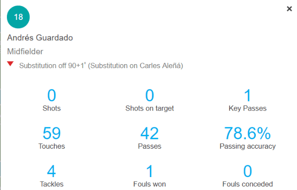 ¿Cómo fue el partido de Guardado? El mediocampista tocó el balón en 59 ocasiones, realizando así 42 pases; por lo que logró un 78% de efectividad. Participó de cuatro entradas por el balón, ganó una infracción y no concedió ninguna.