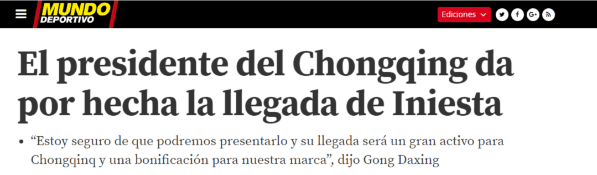 Justamente, el presidente de ese club lo confirmó:“Estoy seguro de que podremos presentar aAndrés Iniestay su llegada será un gran activo paraChongqinqy una bonificación para nuestra marca”.