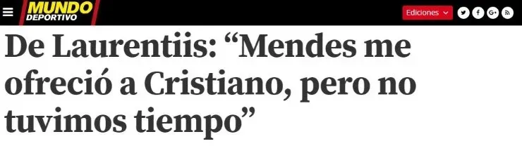Según detalló Mundo Deportivo,Aurelio De Laurentiis, presidente del Napoli, confirmó que el representante del astro portugués,JorgeMendes, le ofreció negociar por el jugador que en ese momento se encontraba en el Real Madrid.