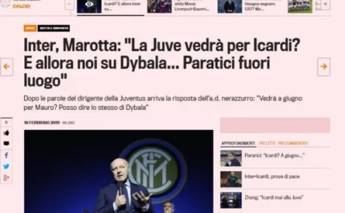 Atento a las declaraciones de FabioParatici sobre la posibilidad de que Juventus vaya en busca de Icardi en enero; el CEO de interGiuseppe Marotta amenazó con devolver gentilezas arrebatándole a Paulo Dybala a los de Turín.