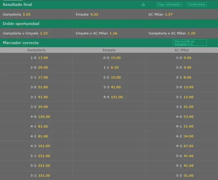 Para el duelo del sueco, bet365 te cuenta que el favorito para ganar es el AC Milan, que paga 1.57 veces lo que juegues, en desmedro de los 5.25 que paga la Sampdoria. Ahora, si te la juegas por el empate, paga 4.33 veces lo que apuestes.