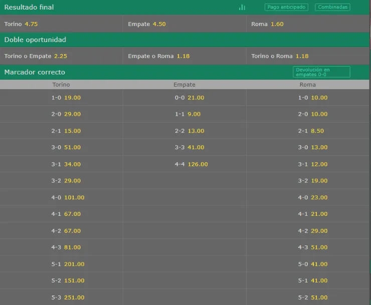 En tanto, para el conjunto de la Roma, bet365 te señala que el favorito para vencer en el juego es la Roma, que paga 1.60 veces lo que juegues, en desmedro de los 4.75 que paga el Torino, y los 4.50 que paga el empate entre ambos.