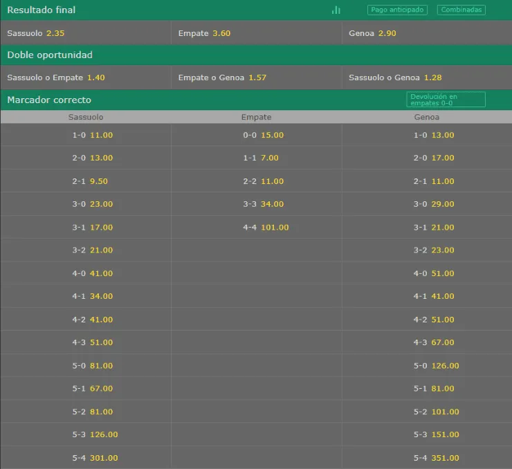 Partidos que también puedes vivir en bet365, y te cuenta que para la llave entre Genoa ante Sassuolo, el favorito para ganar es el Sassuolo, que paga 2.35 veces lo que juegues, en desmedro de los 2.90 del Genoa. Ahora, el empate entre ambos paga 3.60 veces lo que apuestes.