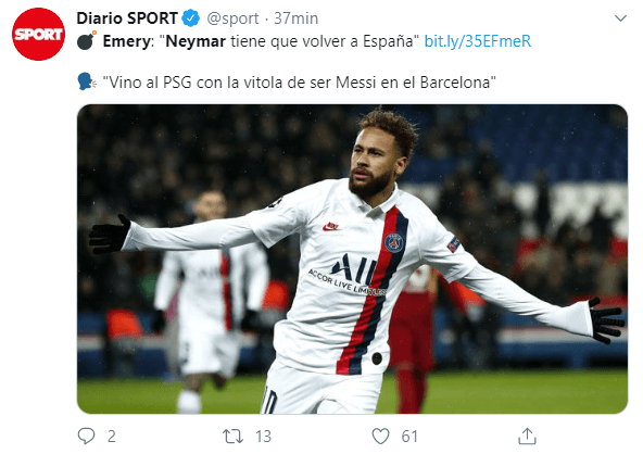 Tras su salida del Arsenal inglés por acumulación de malos resultados, Unai Emery, entrenador español que dirigió y tuvo varios cruces con Neymar en PSG, concedió una entrevista a El Larguero en la que opinó que lo mejor para la carrera del brasileño sería regresar al Barcelona.
