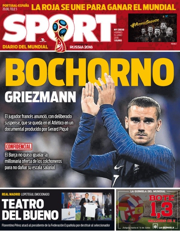 Pero, de todas maneras, la herida que dejó Griezmann sigue abierta y así lo dejó en claro el diario Sport, quien tituló en su edición de hoy “Bochorno”, con una foto a todo color del seleccionado francés.