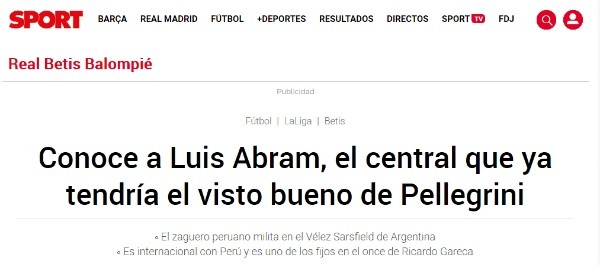 “La oferta del Real Betis (4M€ por Luis Abram) es real“, escribió Jean Martín Dueñas de RPP. “Jugador y su entorno saben del interés. Sporting Cristal mantiene el 20% del pase del jugador. En Vélez esperan que el equipo español se acerque un poco a los 8M€ que piden por el peruano“, detalló más adelante en un tweet.