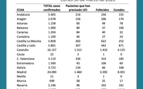 La región de Madrid, donde varios hospitales están saturados y se habilitaron dos morgues y un hospital de campaña en un enorme centro de convenciones, sigue siendo la más golpeada, con poco menos de un tercio de los casos y casi la mitad de los fallecimientos