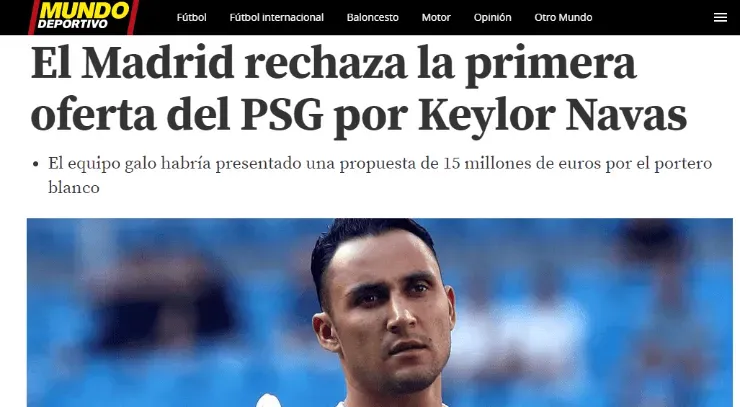 Aparentemente, el cuadro de la Ligue 1 puso sobre la mesa unos 15 millones para contratar a Navas. Sin embargo, el Real Madrid tomó la decisión de rechazar el ofrecimiento, decidiendo asímantener al hombre de Costa Rica.