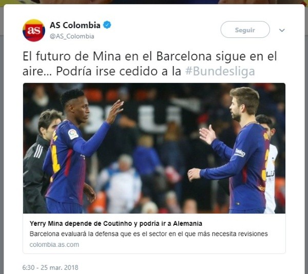 Si Coutinho no consigue los papeles para ser europeo, Mina tendría los días contados en el Barcelona y podría irse a la Bundesliga, tal como informa el diario de Madrid.