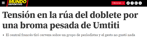 Según publicó Mundo Deportivo, el defensa Blaugrana le tiró cerveza a un grupo de periodistas que cubrían los festejos.