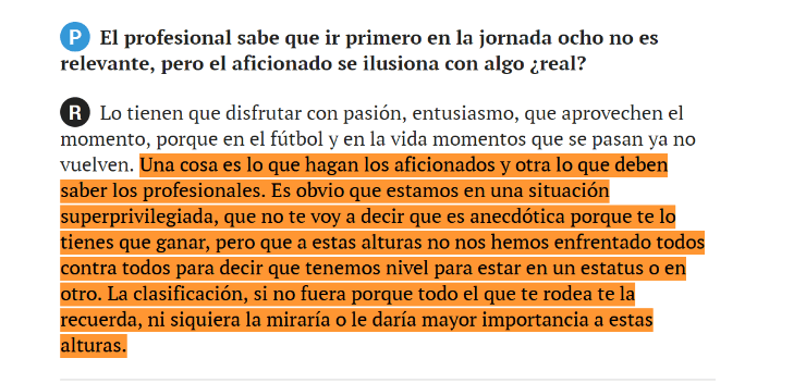 “Una cosa es los aficionados se ilusionen y otra lo que debemos hacer los profesionales. Es obvio que estamos en una situación privilegiada. No es anecdótica, pero a estas alturas todavía no jugamos contra todos los rivales para decir en que estatus estamos. La clasificación, si no fuera porque todo el que te rodea te lo recuerda, ni siquiera la miraría a estas alturas”, contó en una entrevista exclusiva con Marca.
