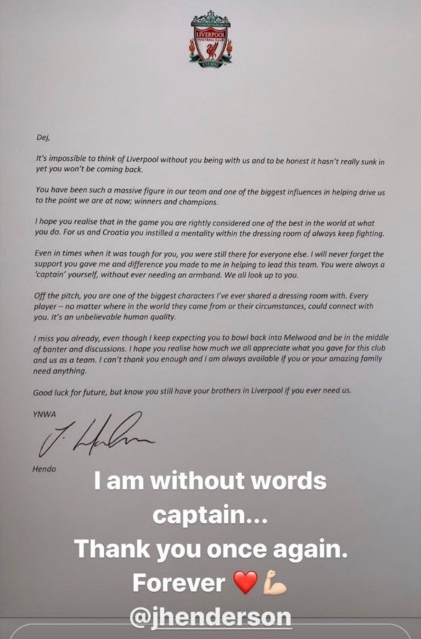 En el presente mercado de pases, poniéndole fin a su ciclo como futbolista de Los Reds, Lovren pasará a defender los colores del Zenit de Rusia, dejando a su paso un ciclo histórico en el equipo de Inglaterra. Henderson, sin pasar por alto la partida de uno de sus compañeros, le envió al oriundo de Croacia una emotiva carta de despedida junto a una pequeña réplica del trofeo de la Premier League.