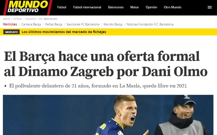 Según reportó Mundo Deportivo, el Barcelona habría enviado a Croacia una oferta suculenta para repatriar aDani Olmo, jugador que dejó dicho club a principios del 2015.
