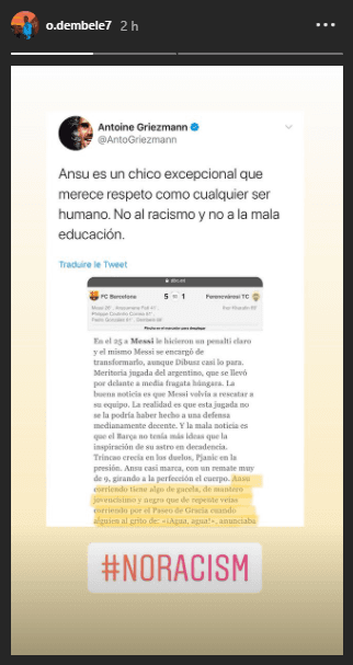 Ousmane Dembélé, por su parte y a través de su cuenta oficial de Instagram, exteriorizó la publicación llevada a cabo por parte de su compañero francés, exigió que se acabe con el racismo y redactó:“#NoRacism”.