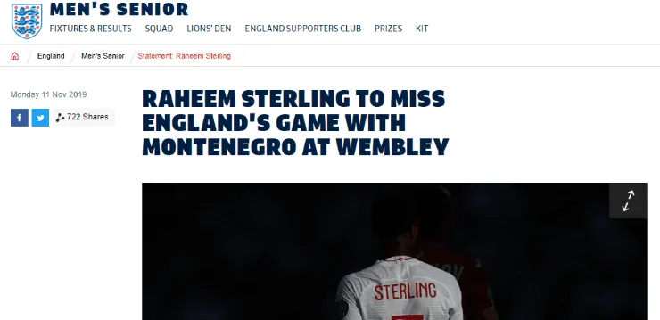 Con respecto a lo sucedido, Gareth Southgate, DT del conjunto nacional, confirmó queSterling no será tenido en cuenta para el próximo compromiso ante Montenegro.“Hemos tomado la decisión de no considerar a Raheem para el partido contra Montenegro del jueves”, afirmó en conferencia de prensa.