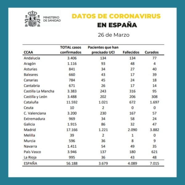 El Ministerio de Sanidad de España actualizó este jueves su parte diario, dando a conocer que el las últimas 24 horas hubo en el país 655 nuevas víctimas fatales.