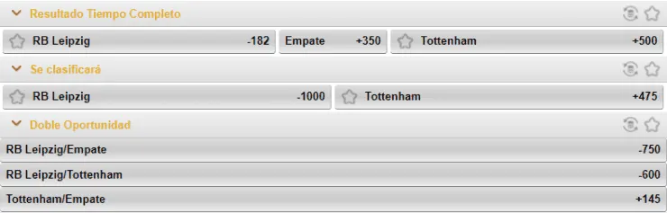 Para Caliente.mx, el favorito para quedarse con esta llave de la UEFA Champions League es el Leipzig, que paga -182, contrario a los +500 que paga el Tottenham de Mourinho si crees que ellos serán los triunfadores. Ahora, el empate paga +350.