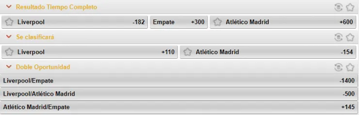En los momios de Caliente.mx, el favorito para ganar es el Liverpool, que paga -182, muy sobre los +600 que paga el Atlético de Madrid para este juego. Si piensas que terminará en empate, paga +300.