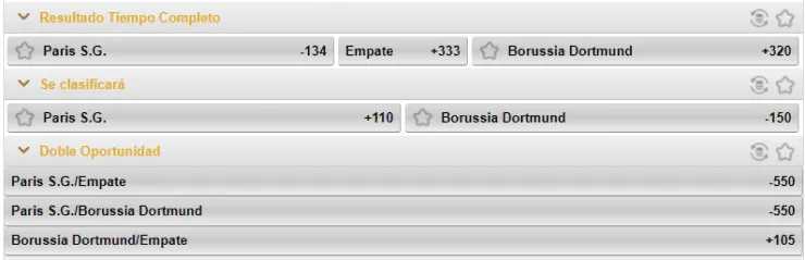 Para el análisis de Caliente.mx, el favorito para vencer en esta llave de la Champions League es el PSG, que paga -134 por sobre los +320 que paga el Borussia Dortmund si crees que ellos ganarán en el tiempo completo. El empate, mientras tanto, paga +333.