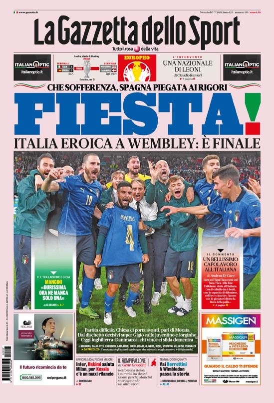 “Fiesta, una heroica Italia avanza a la final”, titulan desde la Gazzetta dello Sport, donde aseguran que la mejor noticia para la Azurri pasa por haber sobrevivido a la noche más difícil en lo que vamos de Eurocopa para los hombres de Roberto Mancini. Ya esperan por Inglaterra o Dinamarca en una final donde buscarán levantar un título esquivo desde 1968.
