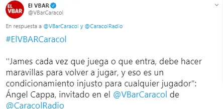 Manifestando que el trato que James recibe cada vez que le toca saltar al campo de juego es diferente al del resto de sus colegas, elescritor manifestó: “James cada vez que juega o que entra, debe hacer maravillas para volver a jugar”.