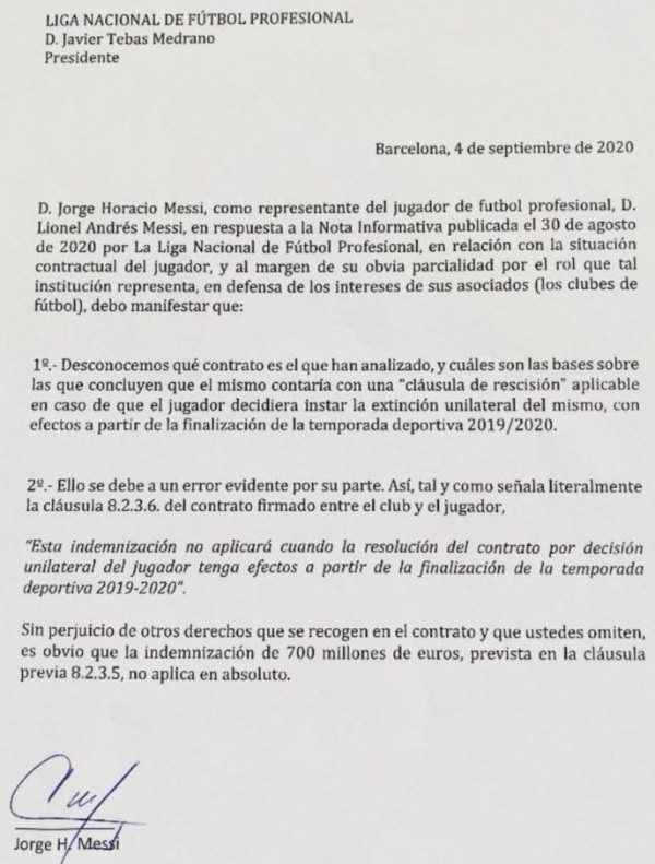 Jorge Horacio Messi, como representante del jugador de fútbol profesional, D. Lionel Andrés Messi, en respuesta a la Nota Informativa publicada el 30 de agosto de 2020 por La Liga Nacional de Fútbol Profesional, en relación con la situación contractual del jugador, y al margen de su obvia parcialidad por el rol que tal institución representa, en defensa de os intereses de sus asociados (los clubes de fútbol), debo manifestar que: