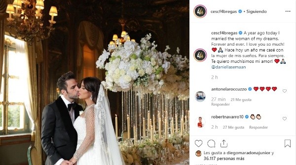Hoy, en el aniversario de un año de casados, Fabregas le dedicó un tierno posteo a ella: “Hace hoy un año me casé con la mujer de mis sueños. Para siempre. Te quiero muchísimos mi amor!”, escribió.