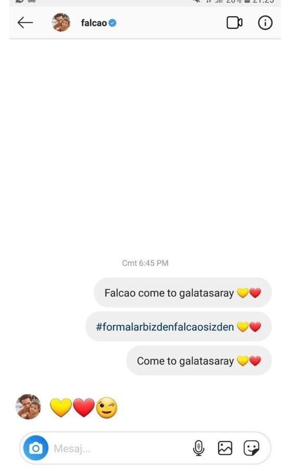 Incluso, el mismo Falcao le contestó un Mensaje Directo por Instagrama un hincha del Galatasaray con dos corazones con los colores del equipo y un guiño de ojo.