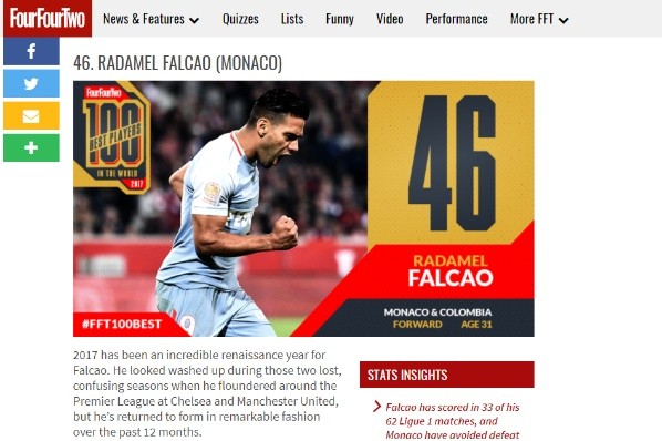 Radamel Falcao es el único colombiano en la lista emitida por una publicación británica donde están los mejores jugadores del año 2017, el atacante ocupa la casilla 46.
