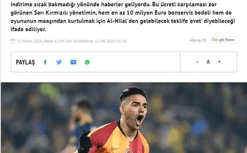 En las últimas horas, varios medios turcos replicaron una información publicada en el periódicoAl-Marsd, en Arabia Saudita. Allí, aseguran que Al Hilal irá con todos los millones para convencer a Galatasaray de vender a Radamel Falcao.