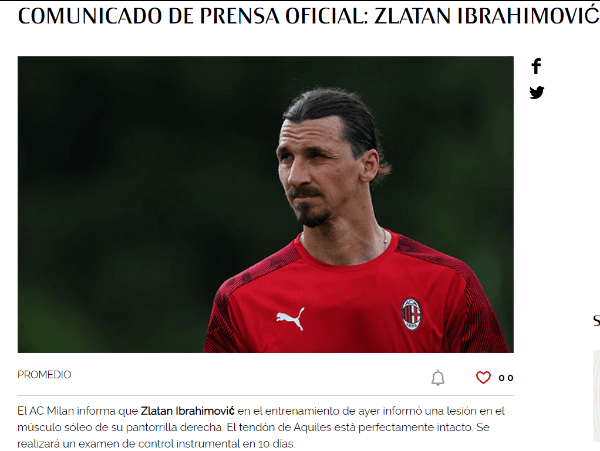 “El AC Milan informa queZlatan Ibrahimovic sufrió en el entrenamiento de ayer una lesión en el músculo sóleo de su pantorrilla derecha. El tendón de Aquiles está perfectamente intacto”, explayaron.