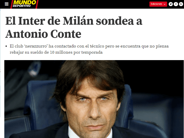 Según avanzóLa Gazzetta dello Sport, la directiva del neroazzurro ya se habría puesto en contacto con Antonio Conte, aunque no habrían llegado a un acuerdo respecto a su salario.
